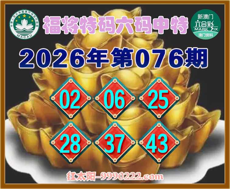 076期: ♣️『福将特码』 ♣️六码中特♣️【02.06.25.28.37.43】开:02