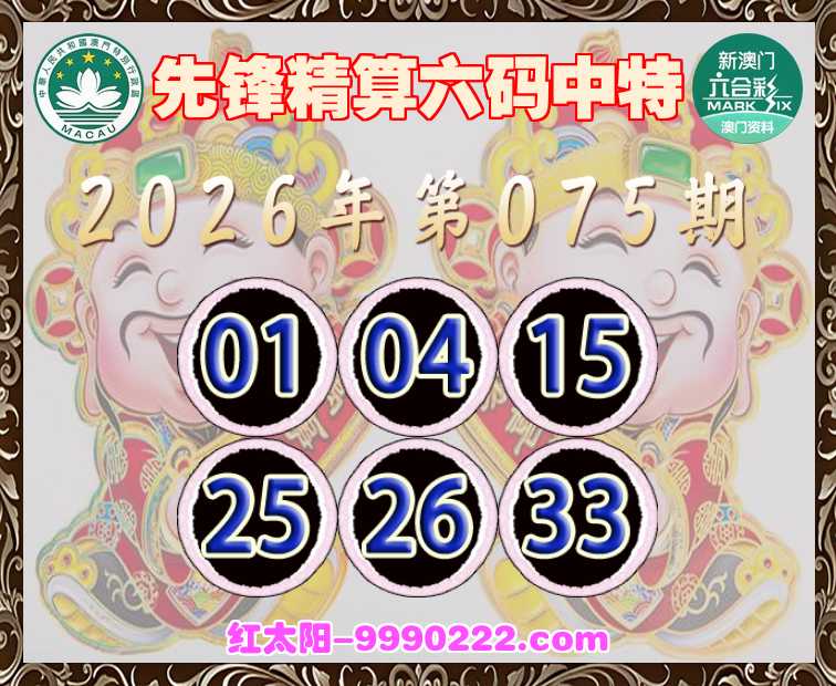 075期:【先锋精算】 ☺️六码中特☺️【01.04.15.25.26.33】开:33